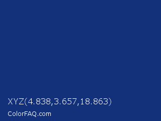 XYZ 4.838,3.657,18.863 Color is a dark blue color and the nearest color is Catalina Blue #062a78. Hex code #13307a and RGB value is rgb(19,48,122). In RGB color space, this color is composed of 7% red, 19% green, 48% blue, In CMYK color space, this color is composed of 84% cyan, 61% magenta, 0% yellow , 52% black , In HSL color space, this color has a hue angle of 223° , 73% saturation and 28% lightness.