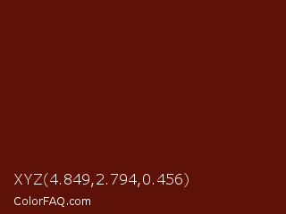 XYZ 4.849,2.794,0.456 Color is a very dark red color and the nearest color is Dark Tan #661010. Hex code #5e1106 and RGB value is rgb(94,17,6). In RGB color space, this color is composed of 37% red, 7% green, 2% blue, In CMYK color space, this color is composed of 0% cyan, 82% magenta, 94% yellow , 63% black , In HSL color space, this color has a hue angle of 8° , 88% saturation and 20% lightness.