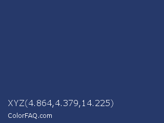 XYZ 4.864,4.379,14.225 Color is a dark blue color and the nearest color is Rhino #2e3f62. Hex code #26396a and RGB value is rgb(38,57,106). In RGB color space, this color is composed of 15% red, 22% green, 42% blue, In CMYK color space, this color is composed of 64% cyan, 46% magenta, 0% yellow , 58% black , In HSL color space, this color has a hue angle of 223° , 47% saturation and 28% lightness.