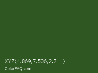 XYZ 4.869,7.536,2.711 Color is a dark green color and the nearest color is Mughal Green #306030. Hex code #2f5722 and RGB value is rgb(47,87,34). In RGB color space, this color is composed of 18% red, 34% green, 13% blue, In CMYK color space, this color is composed of 46% cyan, 0% magenta, 61% yellow , 66% black , In HSL color space, this color has a hue angle of 105° , 44% saturation and 24% lightness.