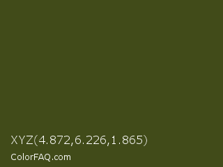 XYZ 4.872,6.226,1.865 Color is a very dark lime color and the nearest color is Clover #384910. Hex code #414b19 and RGB value is rgb(65,75,25). In RGB color space, this color is composed of 25% red, 29% green, 10% blue, In CMYK color space, this color is composed of 13% cyan, 0% magenta, 67% yellow , 71% black , In HSL color space, this color has a hue angle of 72° , 50% saturation and 20% lightness.
