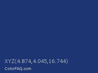 XYZ 4.874,4.045,16.744 Color is a dark blue color and the nearest color is Astronaut #283a77. Hex code #1d3573 and RGB value is rgb(29,53,115). In RGB color space, this color is composed of 11% red, 21% green, 45% blue, In CMYK color space, this color is composed of 75% cyan, 54% magenta, 0% yellow , 55% black , In HSL color space, this color has a hue angle of 223° , 60% saturation and 28% lightness.