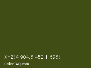 XYZ 4.904,6.452,1.696 Color is a very dark lime color and the nearest color is Clover #384910. Hex code #404d15 and RGB value is rgb(64,77,21). In RGB color space, this color is composed of 25% red, 30% green, 8% blue, In CMYK color space, this color is composed of 17% cyan, 0% magenta, 73% yellow , 70% black , In HSL color space, this color has a hue angle of 74° , 57% saturation and 19% lightness.