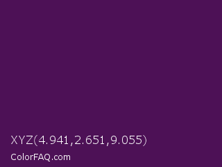 XYZ 4.941,2.651,9.055 Color is a very dark magenta color and the nearest color is Clairvoyant #480656. Hex code #4d1156 and RGB value is rgb(77,17,86). In RGB color space, this color is composed of 30% red, 7% green, 34% blue, In CMYK color space, this color is composed of 10% cyan, 80% magenta, 0% yellow , 66% black , In HSL color space, this color has a hue angle of 292° , 67% saturation and 20% lightness.
