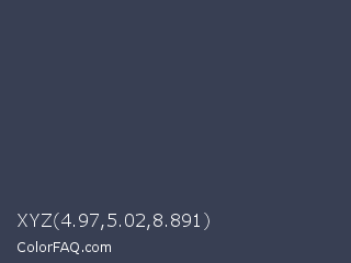 XYZ 4.97,5.02,8.891 Color is a dark blue color and the nearest color is Bright Gray #3c4151. Hex code #383f53 and RGB value is rgb(56,63,83). In RGB color space, this color is composed of 22% red, 25% green, 33% blue, In CMYK color space, this color is composed of 33% cyan, 24% magenta, 0% yellow , 67% black , In HSL color space, this color has a hue angle of 224° , 19% saturation and 27% lightness.