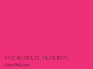 XYZ 40.003,21.74,19.857 Color is a normal rose color and the nearest color is Cerise Pink #ec3b83. Hex code #ef2f78 and RGB value is rgb(239,47,120). In RGB color space, this color is composed of 94% red, 18% green, 47% blue, In CMYK color space, this color is composed of 0% cyan, 80% magenta, 50% yellow , 6% black , In HSL color space, this color has a hue angle of 337° , 86% saturation and 56% lightness.