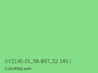 XYZ 40.01,58.897,32.181 Color is a light green color and the nearest color is Pastel Green #77dd77. Hex code #84de87 and RGB value is rgb(132,222,135). In RGB color space, this color is composed of 52% red, 87% green, 53% blue, In CMYK color space, this color is composed of 41% cyan, 0% magenta, 39% yellow , 13% black , In HSL color space, this color has a hue angle of 122° , 58% saturation and 69% lightness.