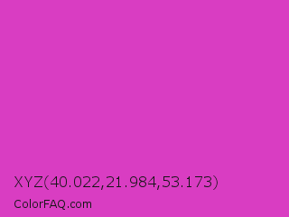 XYZ 40.022,21.984,53.173 Color is a normal magenta color and the nearest color is Steel Pink #cc33cc. Hex code #d93dc2 and RGB value is rgb(217,61,194). In RGB color space, this color is composed of 85% red, 24% green, 76% blue, In CMYK color space, this color is composed of 0% cyan, 72% magenta, 11% yellow , 15% black , In HSL color space, this color has a hue angle of 309° , 67% saturation and 55% lightness.