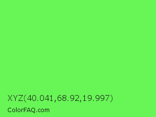 XYZ 40.041,68.92,19.997 Color is a light green color and the nearest color is Screamin Green #66ff66. Hex code #68f556 and RGB value is rgb(104,245,86). In RGB color space, this color is composed of 41% red, 96% green, 34% blue, In CMYK color space, this color is composed of 58% cyan, 0% magenta, 65% yellow , 4% black , In HSL color space, this color has a hue angle of 113° , 89% saturation and 65% lightness.
