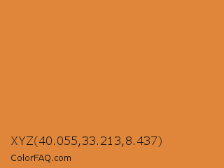 XYZ 40.055,33.213,8.437 Color is a normal orange color and the nearest color is Tigers Eye #e08d3c. Hex code #e0863b and RGB value is rgb(224,134,59). In RGB color space, this color is composed of 88% red, 53% green, 23% blue, In CMYK color space, this color is composed of 0% cyan, 40% magenta, 74% yellow , 12% black , In HSL color space, this color has a hue angle of 27° , 73% saturation and 55% lightness.