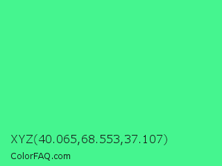 XYZ 40.065,68.553,37.107 Color is a light green color and the nearest color is Very Light Malachite Green #64e986. Hex code #45f58f and RGB value is rgb(69,245,143). In RGB color space, this color is composed of 27% red, 96% green, 56% blue, In CMYK color space, this color is composed of 72% cyan, 0% magenta, 42% yellow , 4% black , In HSL color space, this color has a hue angle of 145° , 90% saturation and 62% lightness.