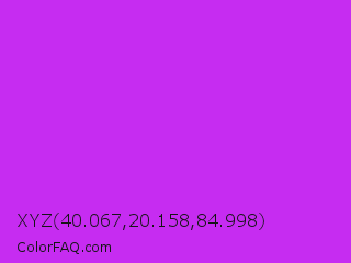 XYZ 40.067,20.158,84.998 Color is a normal purple color and the nearest color is Vivid Mulberry #b80ce3. Hex code #c62cf1 and RGB value is rgb(198,44,241). In RGB color space, this color is composed of 78% red, 17% green, 95% blue, In CMYK color space, this color is composed of 18% cyan, 82% magenta, 0% yellow , 5% black , In HSL color space, this color has a hue angle of 287° , 88% saturation and 56% lightness.