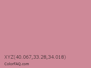 XYZ 40.067,33.28,34.018 Color is a light red color and the nearest color is Puce #cc8899. Hex code #ce8998 and RGB value is rgb(206,137,152). In RGB color space, this color is composed of 81% red, 54% green, 60% blue, In CMYK color space, this color is composed of 0% cyan, 33% magenta, 26% yellow , 19% black , In HSL color space, this color has a hue angle of 347° , 41% saturation and 67% lightness.
