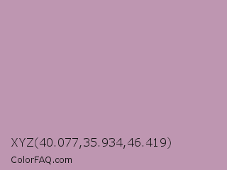 XYZ 40.077,35.934,46.419 Color is a light magenta color and the nearest color is Pastel Purple #b39eb5. Hex code #be96b1 and RGB value is rgb(190,150,177). In RGB color space, this color is composed of 75% red, 59% green, 69% blue, In CMYK color space, this color is composed of 0% cyan, 21% magenta, 7% yellow , 25% black , In HSL color space, this color has a hue angle of 320° , 24% saturation and 67% lightness.