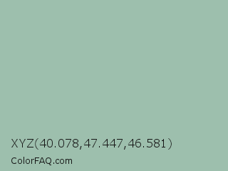 XYZ 40.078,47.447,46.581 Color is a light green color and the nearest color is Cambridge Blue #a3c1ad. Hex code #9dbfad and RGB value is rgb(157,191,173). In RGB color space, this color is composed of 62% red, 75% green, 68% blue, In CMYK color space, this color is composed of 18% cyan, 0% magenta, 9% yellow , 25% black , In HSL color space, this color has a hue angle of 148° , 21% saturation and 68% lightness.