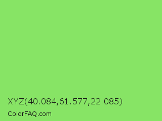 XYZ 40.084,61.577,22.085 Color is a light green color and the nearest color is Pastel Green #77dd77. Hex code #87e465 and RGB value is rgb(135,228,101). In RGB color space, this color is composed of 53% red, 89% green, 40% blue, In CMYK color space, this color is composed of 41% cyan, 0% magenta, 56% yellow , 11% black , In HSL color space, this color has a hue angle of 104° , 70% saturation and 65% lightness.