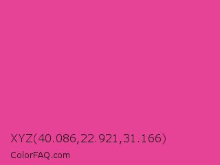XYZ 40.086,22.921,31.166 Color is a normal rose color and the nearest color is Raspberry Pink #e25098. Hex code #e64296 and RGB value is rgb(230,66,150). In RGB color space, this color is composed of 90% red, 26% green, 59% blue, In CMYK color space, this color is composed of 0% cyan, 71% magenta, 35% yellow , 10% black , In HSL color space, this color has a hue angle of 329° , 77% saturation and 58% lightness.