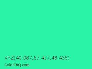 XYZ 40.087,67.417,48.436 Color is a normal green color and the nearest color is Eucalyptus #44d7a8. Hex code #28f3a9 and RGB value is rgb(40,243,169). In RGB color space, this color is composed of 16% red, 95% green, 66% blue, In CMYK color space, this color is composed of 84% cyan, 0% magenta, 30% yellow , 5% black , In HSL color space, this color has a hue angle of 158° , 89% saturation and 55% lightness.
