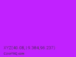 XYZ 40.08,19.384,96.237 Color is a normal purple color and the nearest color is Electric Purple #bf00ff. Hex code #bf21ff and RGB value is rgb(191,33,255). In RGB color space, this color is composed of 75% red, 13% green, 100% blue, In CMYK color space, this color is composed of 25% cyan, 87% magenta, 0% yellow , 0% black , In HSL color space, this color has a hue angle of 283° , 100% saturation and 56% lightness.