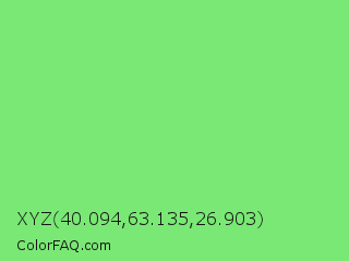 XYZ 40.094,63.135,26.903 Color is a light green color and the nearest color is Pastel Green #77dd77. Hex code #7ae875 and RGB value is rgb(122,232,117). In RGB color space, this color is composed of 48% red, 91% green, 46% blue, In CMYK color space, this color is composed of 47% cyan, 0% magenta, 50% yellow , 9% black , In HSL color space, this color has a hue angle of 117° , 71% saturation and 68% lightness.