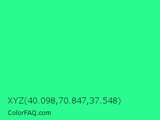 XYZ 40.098,70.847,37.548 Color is a normal green color and the nearest color is Medium Spring Green #00fa9a. Hex code #2afa8f and RGB value is rgb(42,250,143). In RGB color space, this color is composed of 16% red, 98% green, 56% blue, In CMYK color space, this color is composed of 83% cyan, 0% magenta, 43% yellow , 2% black , In HSL color space, this color has a hue angle of 149° , 95% saturation and 57% lightness.