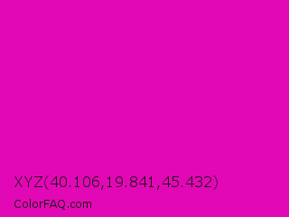 XYZ 40.106,19.841,45.432 Color is a normal magenta color and the nearest color is Hollywood Cerise #f400a1. Hex code #e308b5 and RGB value is rgb(227,8,181). In RGB color space, this color is composed of 89% red, 3% green, 71% blue, In CMYK color space, this color is composed of 0% cyan, 96% magenta, 20% yellow , 11% black , In HSL color space, this color has a hue angle of 313° , 93% saturation and 46% lightness.