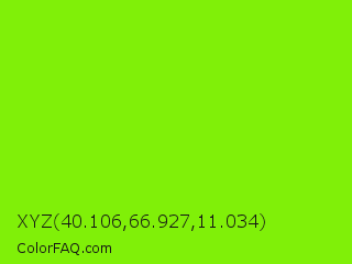 XYZ 40.106,66.927,11.034 Color is a normal green color and the nearest color is Lawn Green #7cfc00. Hex code #80f008 and RGB value is rgb(128,240,8). In RGB color space, this color is composed of 50% red, 94% green, 3% blue, In CMYK color space, this color is composed of 47% cyan, 0% magenta, 97% yellow , 6% black , In HSL color space, this color has a hue angle of 89° , 94% saturation and 49% lightness.