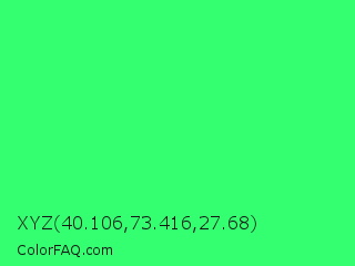 XYZ 40.106,73.416,27.68 Color is a normal green color and the nearest color is UFO Green #3cd070. Hex code #33ff71 and RGB value is rgb(51,255,113). In RGB color space, this color is composed of 20% red, 100% green, 44% blue, In CMYK color space, this color is composed of 80% cyan, 0% magenta, 56% yellow , 0% black , In HSL color space, this color has a hue angle of 138° , 100% saturation and 60% lightness.