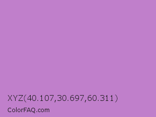 XYZ 40.107,30.697,60.311 Color is a light purple color and the nearest color is African Violet #b284be. Hex code #c07fcb and RGB value is rgb(192,127,203). In RGB color space, this color is composed of 75% red, 50% green, 80% blue, In CMYK color space, this color is composed of 5% cyan, 37% magenta, 0% yellow , 20% black , In HSL color space, this color has a hue angle of 291° , 42% saturation and 65% lightness.