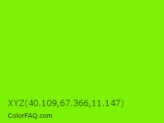 XYZ 40.109,67.366,11.147 Color is a normal green color and the nearest color is Lawn Green #7cfc00. Hex code #7ef109 and RGB value is rgb(126,241,9). In RGB color space, this color is composed of 49% red, 95% green, 4% blue, In CMYK color space, this color is composed of 48% cyan, 0% magenta, 96% yellow , 5% black , In HSL color space, this color has a hue angle of 90° , 93% saturation and 49% lightness.