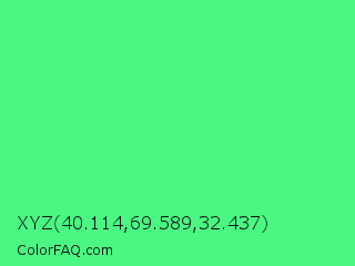 XYZ 40.114,69.589,32.437 Color is a light green color and the nearest color is Very Light Malachite Green #64e986. Hex code #4af782 and RGB value is rgb(74,247,130). In RGB color space, this color is composed of 29% red, 97% green, 51% blue, In CMYK color space, this color is composed of 70% cyan, 0% magenta, 47% yellow , 3% black , In HSL color space, this color has a hue angle of 139° , 92% saturation and 63% lightness.
