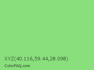 XYZ 40.116,59.44,28.098 Color is a light green color and the nearest color is Pastel Green #77dd77. Hex code #88df7b and RGB value is rgb(136,223,123). In RGB color space, this color is composed of 53% red, 87% green, 48% blue, In CMYK color space, this color is composed of 39% cyan, 0% magenta, 45% yellow , 13% black , In HSL color space, this color has a hue angle of 112° , 61% saturation and 68% lightness.