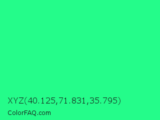 XYZ 40.125,71.831,35.795 Color is a normal green color and the nearest color is Spring Green #00ff7f. Hex code #24fc8a and RGB value is rgb(36,252,138). In RGB color space, this color is composed of 14% red, 99% green, 54% blue, In CMYK color space, this color is composed of 86% cyan, 0% magenta, 45% yellow , 1% black , In HSL color space, this color has a hue angle of 148° , 97% saturation and 56% lightness.