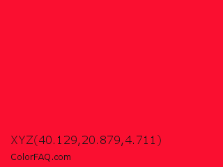XYZ 40.129,20.879,4.711 Color is a normal red color and the nearest color is Torch Red #fd0e35. Hex code #fa0f30 and RGB value is rgb(250,15,48). In RGB color space, this color is composed of 98% red, 6% green, 19% blue, In CMYK color space, this color is composed of 0% cyan, 94% magenta, 81% yellow , 2% black , In HSL color space, this color has a hue angle of 352° , 96% saturation and 52% lightness.