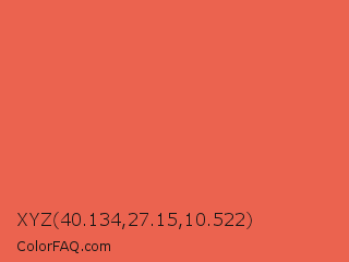 XYZ 40.134,27.15,10.522 Color is a light red color and the nearest color is Jelly Bean #da614e. Hex code #eb634f and RGB value is rgb(235,99,79). In RGB color space, this color is composed of 92% red, 39% green, 31% blue, In CMYK color space, this color is composed of 0% cyan, 58% magenta, 66% yellow , 8% black , In HSL color space, this color has a hue angle of 8° , 80% saturation and 62% lightness.