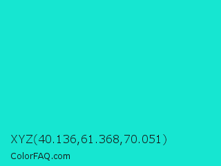 XYZ 40.136,61.368,70.051 Color is a normal cyan color and the nearest color is Bright Turquoise #08e8de. Hex code #16e6d1 and RGB value is rgb(22,230,209). In RGB color space, this color is composed of 9% red, 90% green, 82% blue, In CMYK color space, this color is composed of 90% cyan, 0% magenta, 9% yellow , 10% black , In HSL color space, this color has a hue angle of 174° , 83% saturation and 49% lightness.