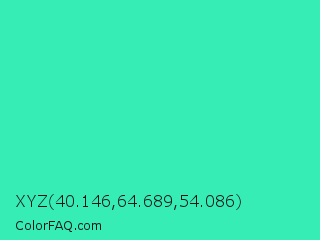 XYZ 40.146,64.689,54.086 Color is a normal green color and the nearest color is Eucalyptus #44d7a8. Hex code #36edb5 and RGB value is rgb(54,237,181). In RGB color space, this color is composed of 21% red, 93% green, 71% blue, In CMYK color space, this color is composed of 77% cyan, 0% magenta, 24% yellow , 7% black , In HSL color space, this color has a hue angle of 162° , 84% saturation and 57% lightness.