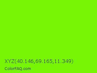 XYZ 40.146,69.165,11.349 Color is a normal green color and the nearest color is Lawn Green #7cfc00. Hex code #76f504 and RGB value is rgb(118,245,4). In RGB color space, this color is composed of 46% red, 96% green, 2% blue, In CMYK color space, this color is composed of 52% cyan, 0% magenta, 98% yellow , 4% black , In HSL color space, this color has a hue angle of 92° , 97% saturation and 49% lightness.