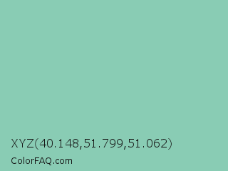 XYZ 40.148,51.799,51.062 Color is a light green color and the nearest color is Vista Blue #8fd6b4. Hex code #89ccb4 and RGB value is rgb(137,204,180). In RGB color space, this color is composed of 54% red, 80% green, 71% blue, In CMYK color space, this color is composed of 33% cyan, 0% magenta, 12% yellow , 20% black , In HSL color space, this color has a hue angle of 159° , 40% saturation and 67% lightness.