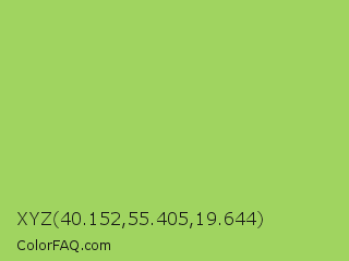 XYZ 40.152,55.405,19.644 Color is a normal green color and the nearest color is Middle Green Yellow #acbf60. Hex code #a0d460 and RGB value is rgb(160,212,96). In RGB color space, this color is composed of 63% red, 83% green, 38% blue, In CMYK color space, this color is composed of 25% cyan, 0% magenta, 55% yellow , 17% black , In HSL color space, this color has a hue angle of 87° , 57% saturation and 60% lightness.
