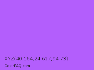 XYZ 40.164,24.617,94.73 Color is a light purple color and the nearest color is Navy Purple #9457eb. Hex code #b35efc and RGB value is rgb(179,94,252). In RGB color space, this color is composed of 70% red, 37% green, 99% blue, In CMYK color space, this color is composed of 29% cyan, 63% magenta, 0% yellow , 1% black , In HSL color space, this color has a hue angle of 272° , 96% saturation and 68% lightness.