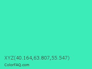 XYZ 40.164,63.807,55.547 Color is a normal green color and the nearest color is Turquoise #40e0d0. Hex code #3bebb8 and RGB value is rgb(59,235,184). In RGB color space, this color is composed of 23% red, 92% green, 72% blue, In CMYK color space, this color is composed of 75% cyan, 0% magenta, 22% yellow , 8% black , In HSL color space, this color has a hue angle of 163° , 81% saturation and 58% lightness.