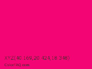 XYZ 40.169,20.424,18.348 Color is a normal rose color and the nearest color is Winter Sky #ff007c. Hex code #f30574 and RGB value is rgb(243,5,116). In RGB color space, this color is composed of 95% red, 2% green, 45% blue, In CMYK color space, this color is composed of 0% cyan, 98% magenta, 52% yellow , 5% black , In HSL color space, this color has a hue angle of 332° , 96% saturation and 49% lightness.