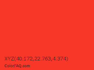 XYZ 40.172,22.763,4.374 Color is a normal red color and the nearest color is Red Orange #ff3f34. Hex code #f73829 and RGB value is rgb(247,56,41). In RGB color space, this color is composed of 97% red, 22% green, 16% blue, In CMYK color space, this color is composed of 0% cyan, 77% magenta, 83% yellow , 3% black , In HSL color space, this color has a hue angle of 4° , 93% saturation and 56% lightness.