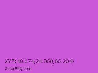 XYZ 40.174,24.368,66.204 Color is a normal magenta color and the nearest color is Medium Orchid #ba55d3. Hex code #cb57d6 and RGB value is rgb(203,87,214). In RGB color space, this color is composed of 80% red, 34% green, 84% blue, In CMYK color space, this color is composed of 5% cyan, 59% magenta, 0% yellow , 16% black , In HSL color space, this color has a hue angle of 295° , 61% saturation and 59% lightness.