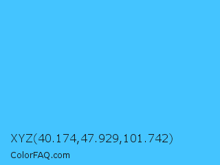 XYZ 40.174,47.929,101.742 Color is a light blue color and the nearest color is Picton Blue #45b1e8. Hex code #44c4ff and RGB value is rgb(68,196,255). In RGB color space, this color is composed of 27% red, 77% green, 100% blue, In CMYK color space, this color is composed of 73% cyan, 23% magenta, 0% yellow , 0% black , In HSL color space, this color has a hue angle of 199° , 100% saturation and 63% lightness.