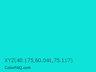 XYZ 40.175,60.041,75.117 Color is a normal cyan color and the nearest color is Bright Turquoise #08e8de. Hex code #0ee3d9 and RGB value is rgb(14,227,217). In RGB color space, this color is composed of 5% red, 89% green, 85% blue, In CMYK color space, this color is composed of 94% cyan, 0% magenta, 4% yellow , 11% black , In HSL color space, this color has a hue angle of 177° , 88% saturation and 47% lightness.