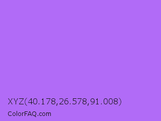 XYZ 40.178,26.578,91.008 Color is a light violet color and the nearest color is Lavender #b57edc. Hex code #b16bf7 and RGB value is rgb(177,107,247). In RGB color space, this color is composed of 69% red, 42% green, 97% blue, In CMYK color space, this color is composed of 28% cyan, 57% magenta, 0% yellow , 3% black , In HSL color space, this color has a hue angle of 270° , 90% saturation and 69% lightness.
