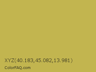 XYZ 40.183,45.082,13.981 Color is a normal yellow color and the nearest color is Vegas Gold #c5b358. Hex code #c2b54f and RGB value is rgb(194,181,79). In RGB color space, this color is composed of 76% red, 71% green, 31% blue, In CMYK color space, this color is composed of 0% cyan, 7% magenta, 59% yellow , 24% black , In HSL color space, this color has a hue angle of 53° , 49% saturation and 54% lightness.