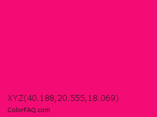 XYZ 40.188,20.555,18.069 Color is a normal rose color and the nearest color is Vivid Raspberry #ff006c. Hex code #f30c73 and RGB value is rgb(243,12,115). In RGB color space, this color is composed of 95% red, 5% green, 45% blue, In CMYK color space, this color is composed of 0% cyan, 95% magenta, 53% yellow , 5% black , In HSL color space, this color has a hue angle of 333° , 91% saturation and 50% lightness.